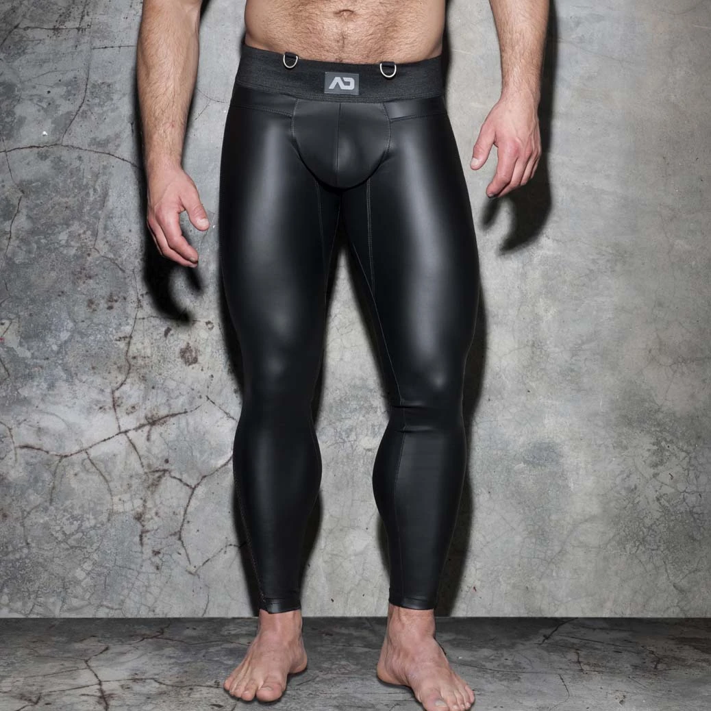 These leggings feature a sleek, black stretch fabric with a synthetic leather-effect finish that hugs every curve. The sides are accented with breathable mesh panels and rugged metal buckles, adding an industrial edge to the provocative low-waist silhouette. The signature AD logo in silicone is prominently displayed on the waistband for a premium finish.