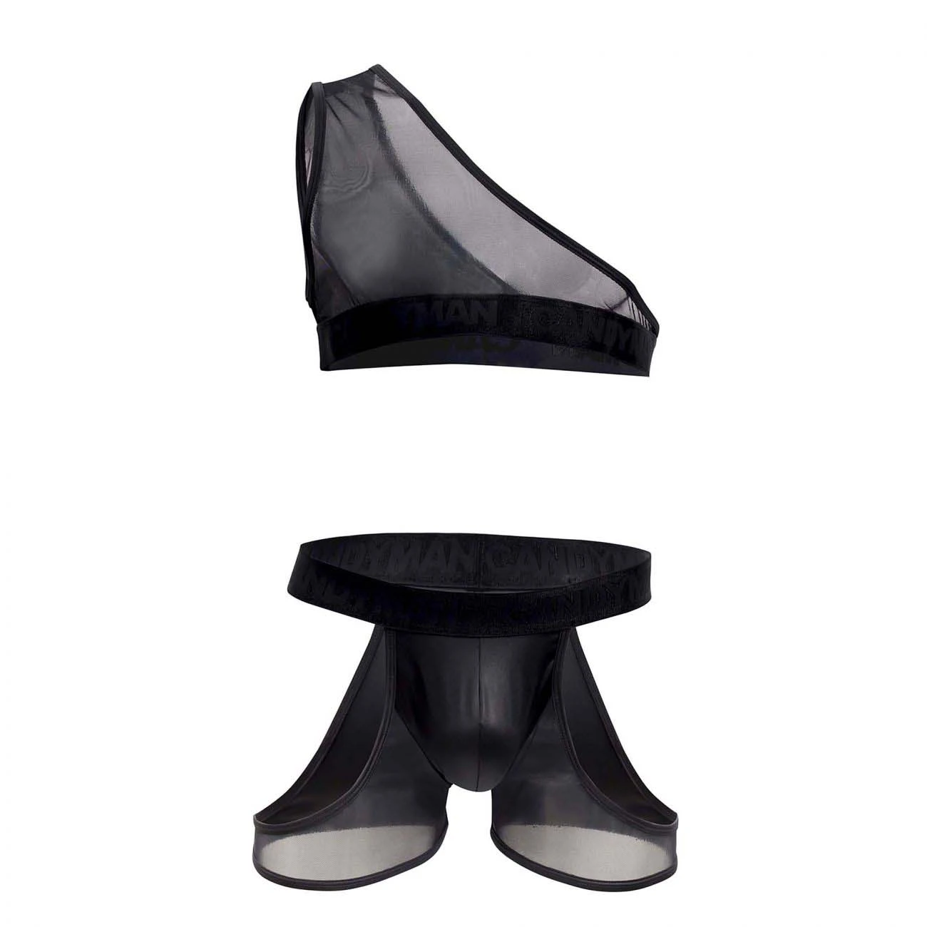This set features a unique asymmetric crop top crafted from high-quality mesh, providing a striking one-shoulder silhouette. The branded Candyman elastic waistband adds a bold, sporty contrast, while the bottoms utilize a strategic mix of opaque fabric and mesh paneling. With open sides designed to maximize allure, this set highlights the male physique from every angle.