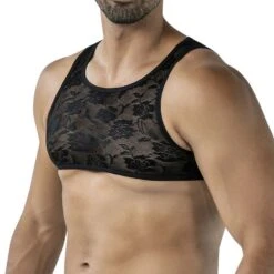 Debardeur Cut4Men Black Lacey C4MRAV120. Debardeur Crop Top original et sensuel conçu pour les hommes qui souhaitent allier raffinement, audace et confort. Son tissu en dentelle noire dévoile subtilement le torse, tandis que sa coupe ergonomique souligne naturellement la silhouette. 88% Polyamide, 12% Elasthanne.