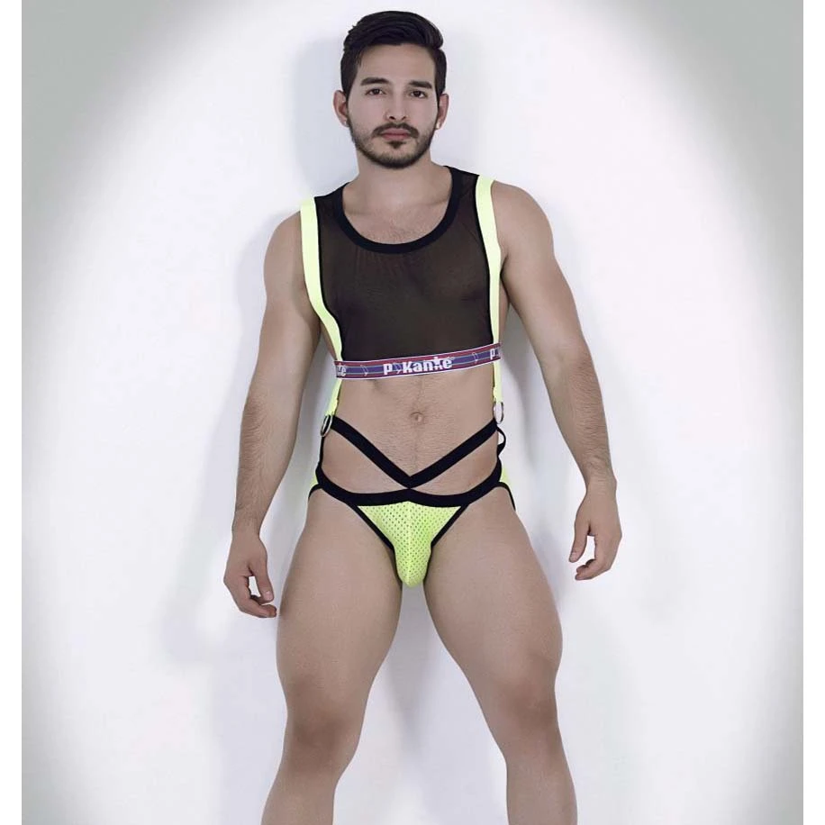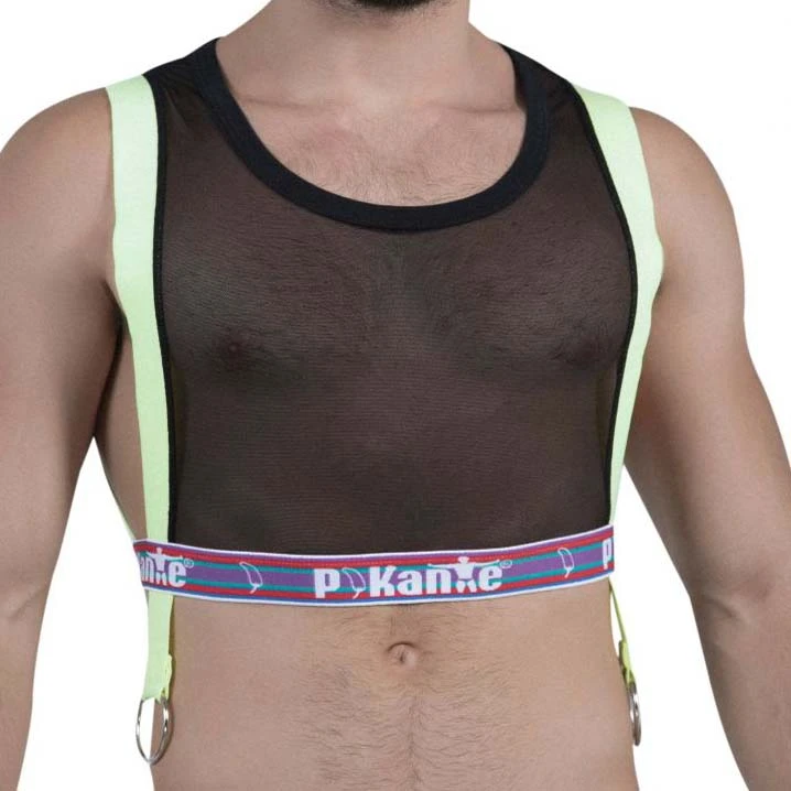 Le PIK7010 se distingue par son tissu en microfibre r)sistant, l)ger et parfaitement respirant. Le corps du harnais est r)alis) dans un mesh transparent noir qui laisse deviner la peau tout en structurant la silhouette. La large bande )lastique inf)rieure, arborant fi(rement le logo et la marque imprim)s, assure un maintien impeccable et une signature stylistique forte.