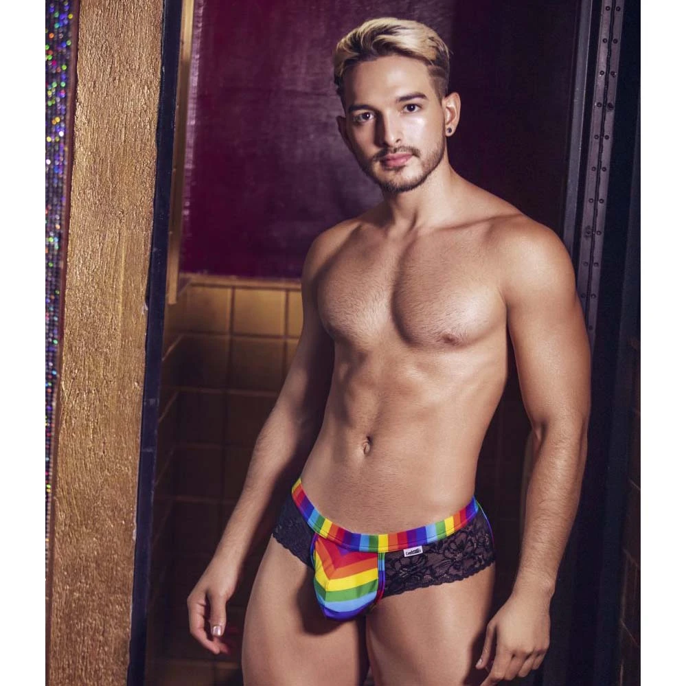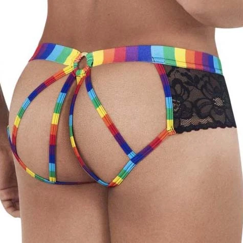 Jock Strap Candyman Pride Lace 99498. Jock Strap très sexy qui joue la carte de la sensualité un mélange de dentelle et un imprimé multicolor. Ouvert à larrière avec des ficelles multicolores. Très minimaliste vous allez adorer le porter. 78% Polyester, 22% Elasthanne.