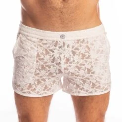 Indulge in the feeling of a second skin with the L’Homme Invisible White Lotus HW130ARA short. Designed for the modern man who values both romantic chic and high-fashion aesthetics, this white lace short allows the air to graze your body through its beautiful, soft floral embroidery.