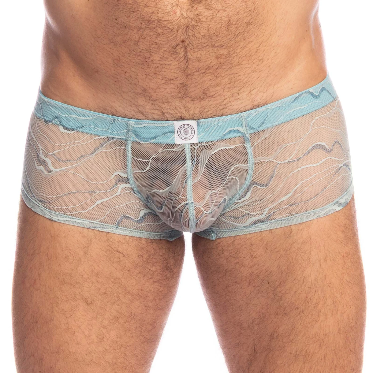 Shorty L Homme Invisible Aqua UW09AQU. Découvrez le charme irrésistible de ce Shorty dans une dentelle bleu clair raffinée, légère et délicate, qui caresse votre peau tout en dévoilant subtilement ce quil y a en dessous. Poche frontale ergonomique qui assure un maintien naturel avec un effet push-up avantageux. Couture à l’arriere qui épouse parfaitement le galbe des fesses, créant une ligne ajustée sans excès de matière. 78% Polyamide, 21% Elasthanne, 1% Métal.