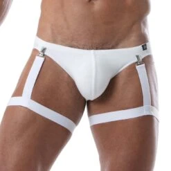 - Visual Design: Featuring sleek black elastic bands and industrial-style metal clips, this single-leg harness creates a striking silhouette that pairs perfectly with any brief or jockstrap.